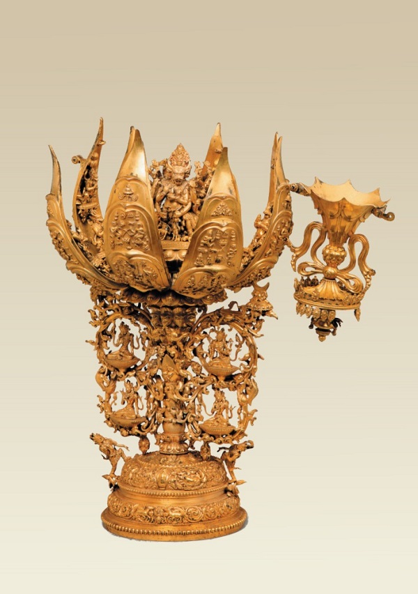 Statue de Yamantaka en bronze doré, sur lotus à huit pétales, portant l'inscription ? Offert durant l'ère Yongle de la dynastie Ming ?, conservée au palais du Potala. Photo fournie par l'Administration du palais du Potala.