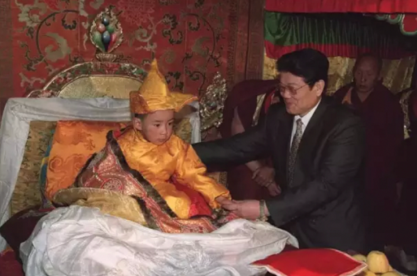 Le panchen Rinpoche lors de son intronisation, avec le soutien du représentant du Conseil des affaires d'état et conseiller d'état Li Tieying / source : Agence Xinhua