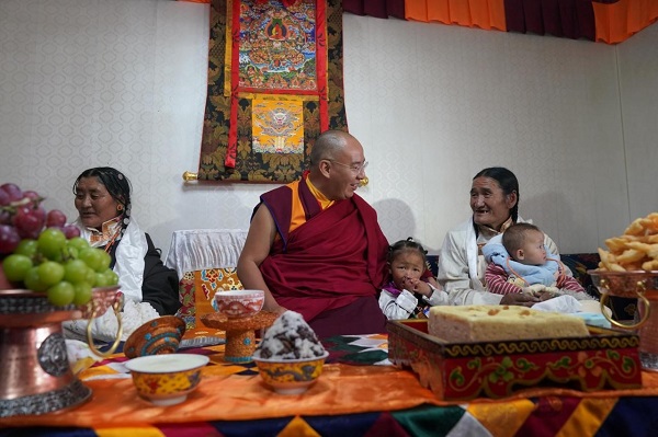 Le panchen Rinpoche menant une enquête auprès d'habitants agriculteurs et éleveurs des zones frontalières au poste frontière de Lêgzê, dans le comté de Zhongba de la ville de Shigatse