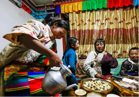 Le 3 février de cette année, était le 29 décembre du calendrier traditionnel tibétain et ce jour-là, toute la famille de Lanan, qui venait d'emménager dans son nouveau domicile, a fêté son premier Nouvel An tibétain après son déménagement. A cette occasion, toute la famille s'est réunie pour go?ter au ? Gutu ?, à la profonde signification. (Photo / vip.people.com.cn)