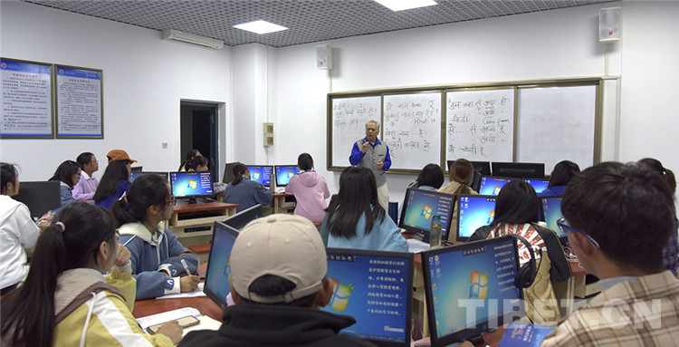 Des étudiants en hindi de l'école des langues étrangères de l'Université des nationalités du Tibet dans un cours d'hindi parlé.