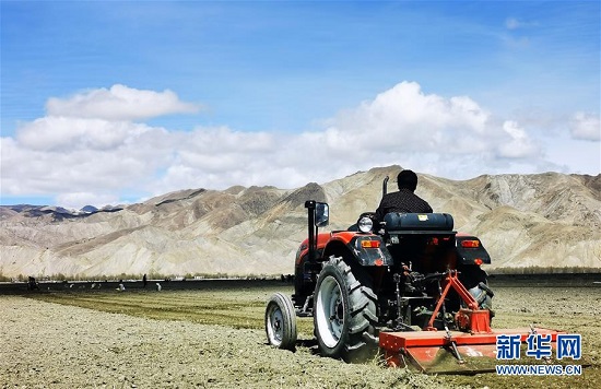Tsiwang, un villageois de 35 ans vivant dans le village de Tangjue, à Luojiang du district de Bailang, dans la ville de Shigatsé, conduit un tracteur et cultive sa terre. Sa famille cultive plus de 60 acres de terre, et l'année dernière, ils ont récolté plus de 20 000 kg d'orge du haut plateau, ce qui correspond à un revenu annuel de plus de 50 000 yuans.