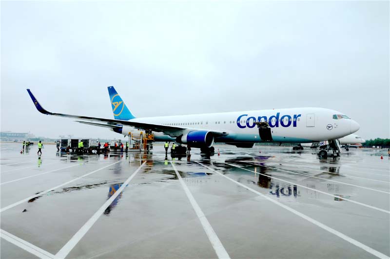 à bord de l'avion cargo, exploité par Condor, une compagnie aérienne basée à Francfort, se trouvaient près de 1 000 bo?tes de produits médicaux achetés dans différentes villes de Chine, notamment des masques faciaux et des thermomètres infrarouges, qui seront utilisés en Europe dans la lutte contre le COVID-19. Condor prévoit quatre vols par semaine.