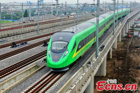 Un train à grande vitesse vert Fuxing effectue un parcours d'essai sur la ligne Nantong-Shanghai, le 26 mai 2020. (Photo / China News Service)