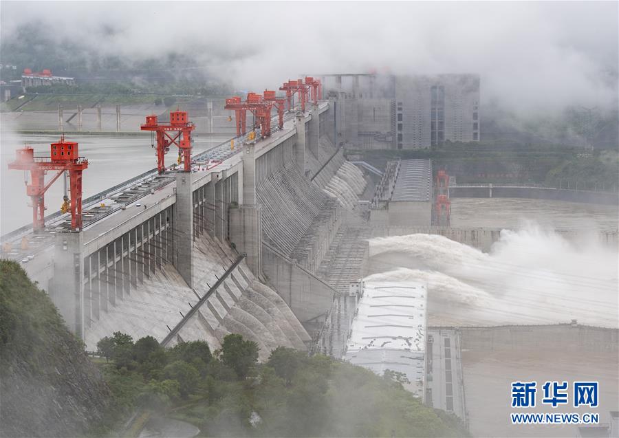 Photos aériennes prises le 29 juin 2020, montrant de l'eau jaillissant des écluses du réservoir des Trois Gorges. Affectée par de fortes pluies dans les cours moyen et supérieur du fleuve Yangtsé, la quantité d'eau entrant dans le réservoir des Trois Gorges a continué d'augmenter ces dernières semaines. Afin de libérer une capacité de stockage pour faire face aux éventuelles inondations, le réservoir des Trois Gorges a ouvert deux écluses le 29 juin pour augmenter son débit de rejet. Il s'agit de la première décharge du réservoir de cette année. (Photo: Xiao Yijiu/Xinhua)