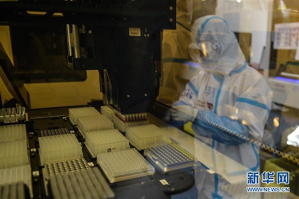 Photo prise le 1er juillet, montrant un membre du personnel en train d'effectuer un test avec un équipement pour la PCR (Polymerase Chain Reaction) au laboratoire gonflable de dépistage du COVID-19. Installé dans un centre sportif de l'arrondissement de Daxing à Beijing, le laboratoire baptisé ? Huoyan ? est composé de seize pièces gonflables. Plus de 700000 tests d'acide nucléique y ont été réalisés jusqu'ici. (Photo: Peng Ziyang/Xinhua)