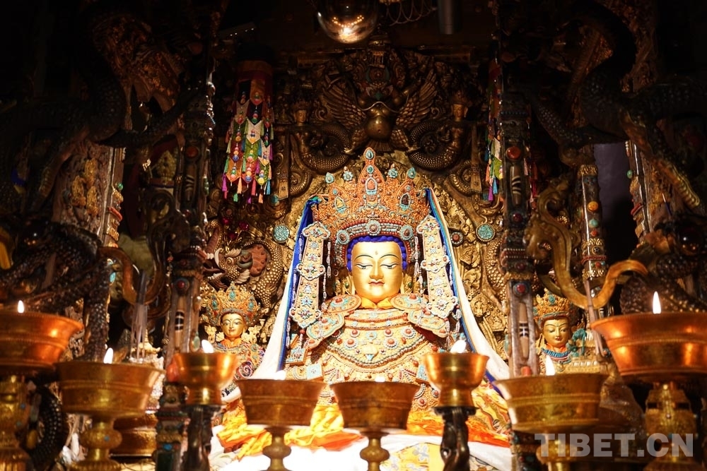 Devant la statue du Bouddha Sakyamuni, agée de 12 ans, qui a été amenée sur le plateau enneigé par la princesse Wencheng sous la dynastie des Tang, le 11e Panchen Lama a appliqué avec révérence et solennité un peu de poudre d'or sur la statue. Ensuite, il a incliné sa tête et a prié, et lui a offert khata.