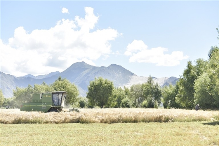 A 11 heures le 1er septembre, nous sommes arrivés au 4e groupe du village de Tsapanang, dans le district de Chushur de la ville de Lhassa. Les villageois s'affairaient déjà dans les champs. L'orge dorée était ? introduite dans la moissonneuse, qui recrachait des bottes. En quelques minutes, l'orge était ainsi récoltée. Le tracteur est arrivé, et tout le monde a travaillé ensemble pour charger l'orge emballée sur le tracteur, qui a été ensuite transporté pour être traité.