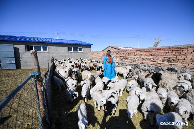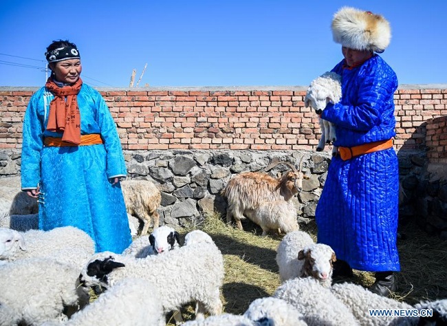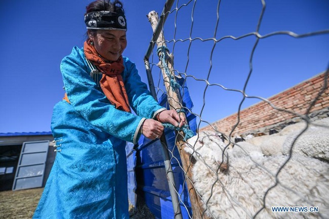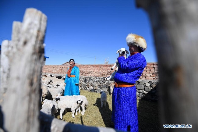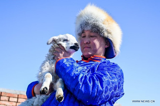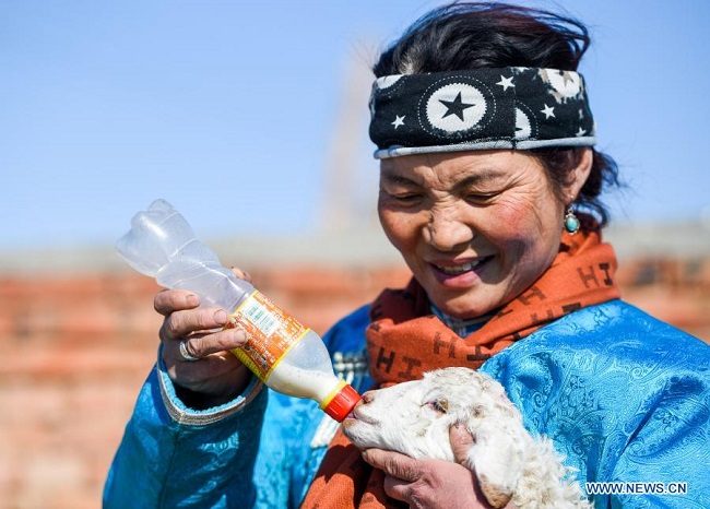 Un berger contr?le un agneau à Xilinhot, dans la région autonome de Mongolie intérieure (nord de la Chine), le 24 février 2021. A l'approche des jours plus chauds, les bergers des prairies de Xilingol sont occupés par les soins aux agneaux.