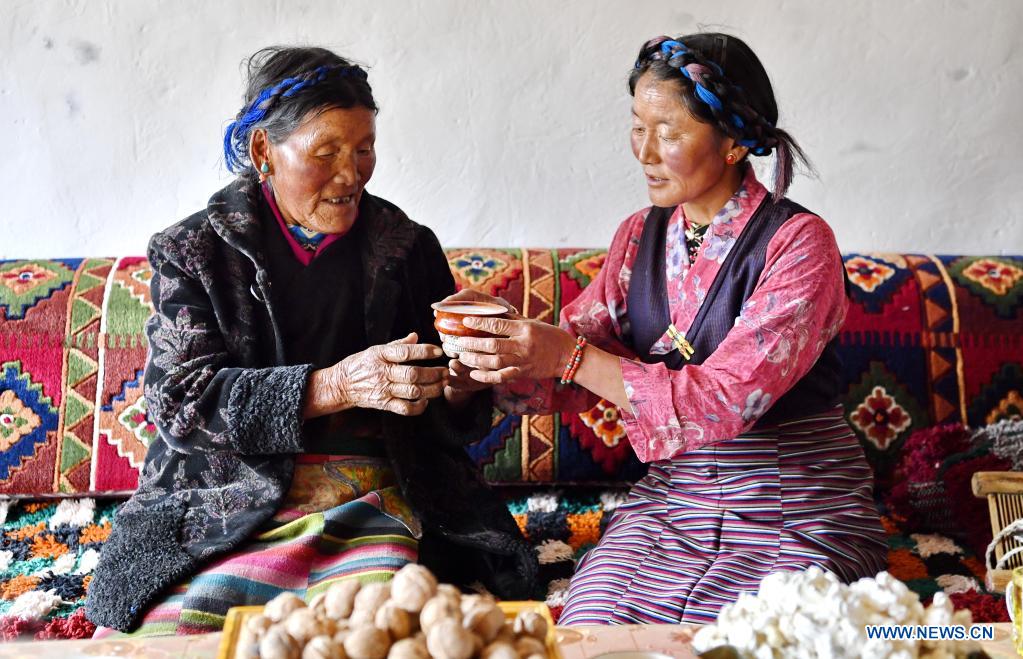 Lhapa (à gauche) et sa fille posent pour une photo dans le village de Puga, à Shigatsé, dans la région autonome du Tibet (sud-ouest de la Chine), le 20 mars 2021. (Sun Ruibo / Xinhua)