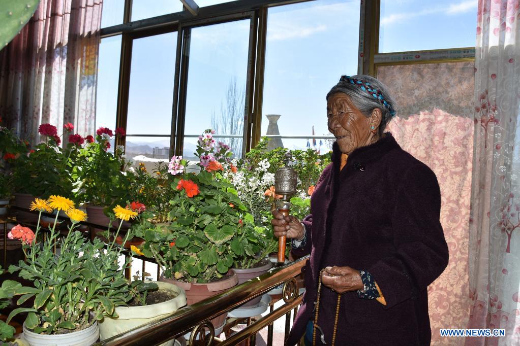Photo montrant Penpa Tsamjo chez elle dans une résidence de Shigatsé, dans la région autonome du Tibet (sud-ouest de la Chine), le 27 mars 2020.  (Liu Hongming / Xinhua)