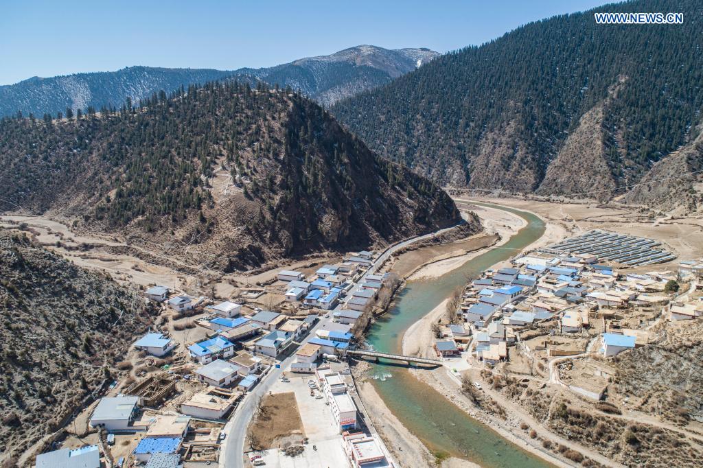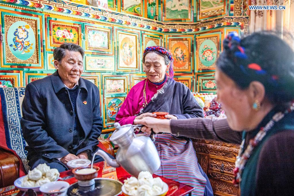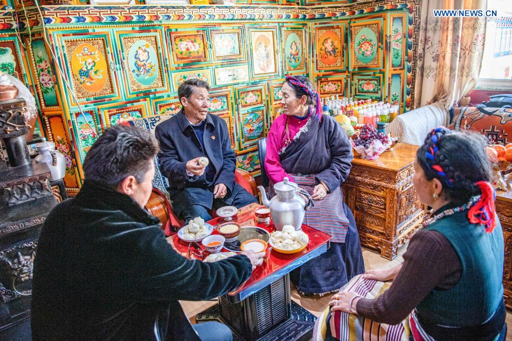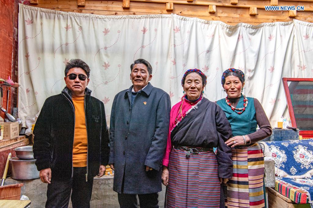 Losang Namgyal (2e à gauche) pose pour une photo avec sa famille dans la ville de Qamdo, dans la région autonome du Tibet (sud-ouest de la Chine), le 19 février 2021 (Sun Fei / Xinhua)