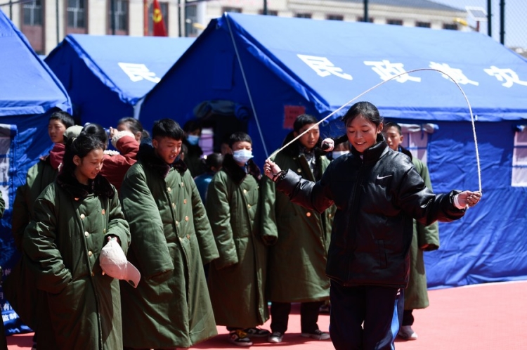 Curmey Drolma saute à la corde lors d'une pause à l'école au district de Maduo de la préfecture autonome tibétaine de Golog, dans la province chinoise du Qinghai (nord-ouest), le 24 mai 2021. (Photo : Zhang Long)