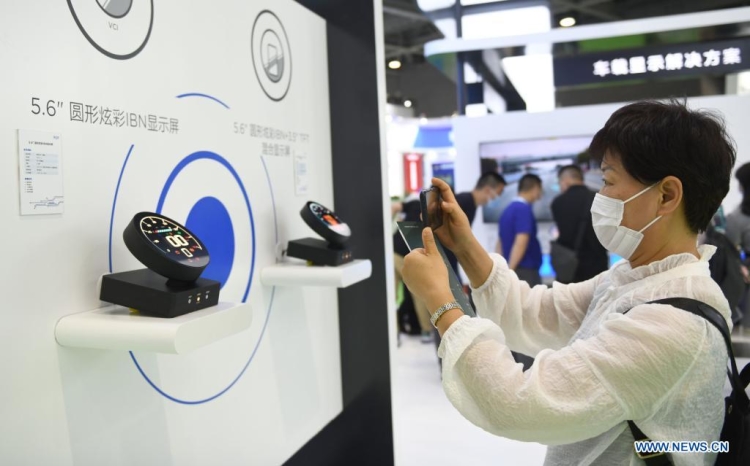 Un acheteur prend des photos d'un écran d'affichage automobile lors du Salon international des technologies automobiles de Guangzhou 2021, à Guangzhou, capitale de la province du Guangdong (sud de la Chine), le 25 mai 2021. L'exposition s'est ouverte ici mardi. (Lu Hanxin / Xinhua)