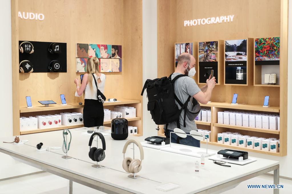 Photo prise le 8 juin 2021 montrant une vue extérieure du magasin phare de Huawei à Berlin, capitale de l'Allemagne. Huawei a dévoilé le 9 juin son premier magasin phare d'Allemagne, qui est également le cinquième magasin phare du géant chinois des télécommunications en Europe. (Shan Yuqi / Xinhua)