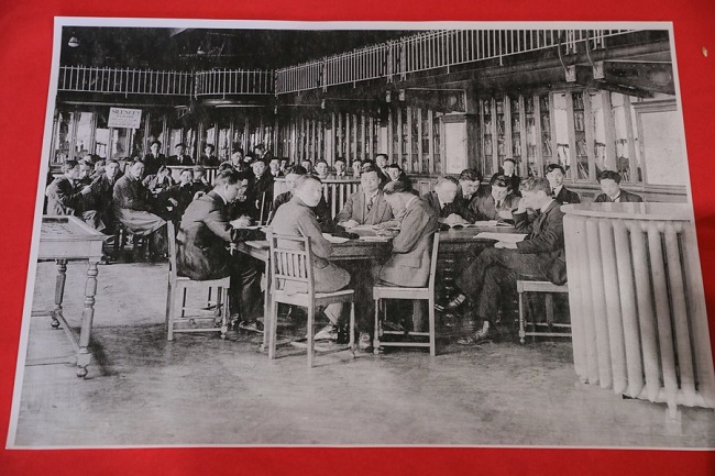 Photo prise le 20 avril 2021 à l'Université du Travail de Charleroi, dans le sud de la Belgique montrant une photo d'archives des étudiants chinois dans la bibliothèque de cette université dans les années 1920. (Xinhua/Zheng Huansong)