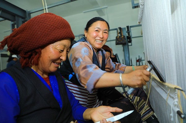 Des employées de la coopérative professionnelle de tissage Tagba des femmes dans le canton de Konggar, dans le district de Maizhokunggar de la ville de Lhassa, en train de tisser des tapis.