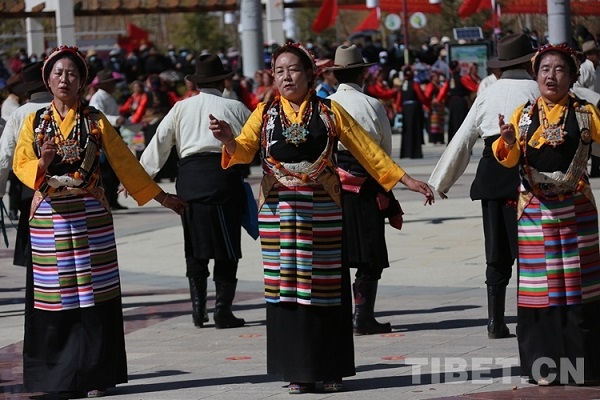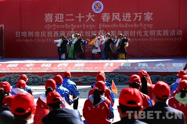 Après la représentation culturelle et artistique, la joyeuse musique de danse Guozhuang a retenti sur la scène. Plus de 400 personnes de tous les groupes ethniques à Shigatsé ont dansé la danse traditionnelle. Avec une si grande fête, ils ont célébré ensemble la libération de la souffrance et la renaissance d'il y a 63 ans, ainsi que la vie heureuse aujourd'hui.