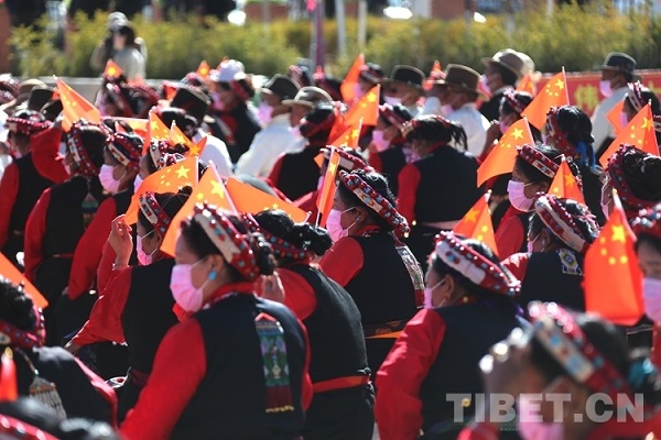 A 10h30 du matin, accompagné du chant et de la danse ? éloge du bonheur ?, une représentation spéciale pour célébrer le 63e anniversaire de l'émancipation d'un million de serfs au Tibet a débuté. Des programmes tels que ? Marcher dans la nouvelle ville ?, ? le serf libéré chante ? et ? Comparaison de l'ancien et du nouveau ? ont été des points culminants les uns après les autres sur la scène. Sous la scène, des gens de toutes les ethnies en costumes, agitant constamment le drapeau rouge à cinq étoiles dans leur main, avaient des sourires émus et heureux sur leurs visages.