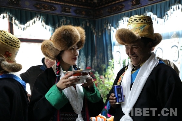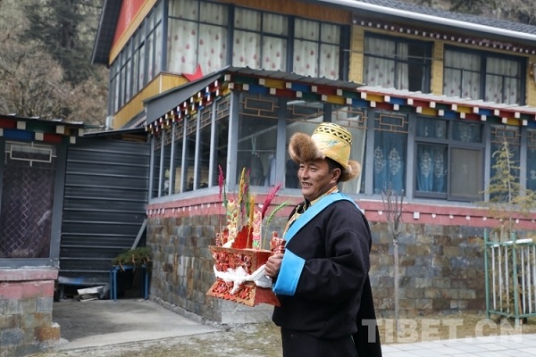 Dans le village de Niulintang, canton de Yulmed, Lozang Tashi, le secrétaire de la branche du Parti du village, était également vêtu de costumes. Lui et les villageois ont apporté la bo?te Qiema chez des voisins pour se rendre visite, se présentant des hada et se servant du Qiema. Tous les foyers du canton de Yulmed ont ri avec joie, célébrant ensemble le Nouvel An tibétain joyeux et propice !