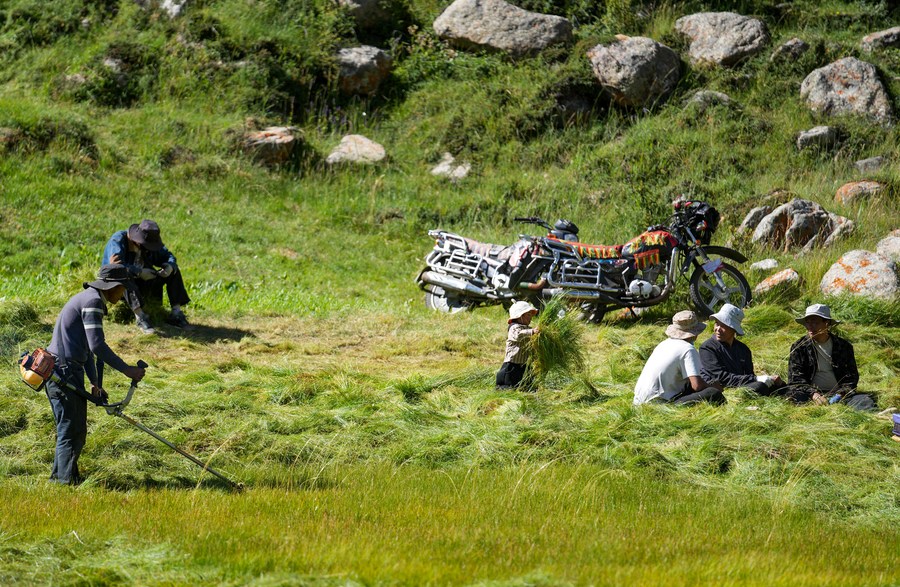 Des agriculteurs récoltent des pailles dans le district de Banbar, dans la région autonome du Tibet (sud-ouest de la Chine), le 17 ao?t 2023. (Photo : Jiang Fan)