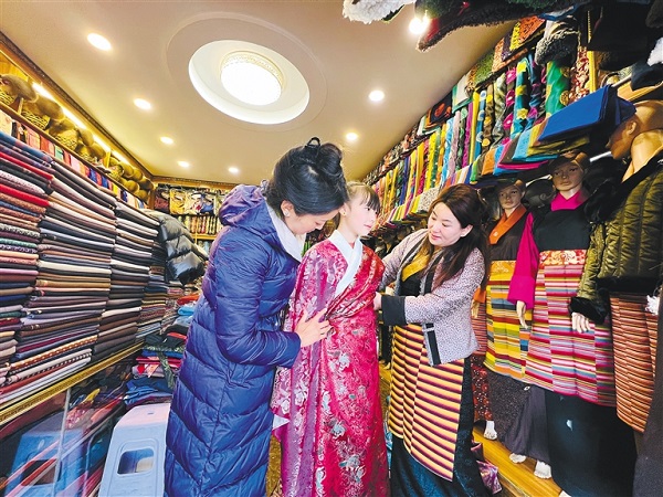 à l'approche de la fête du Printemps et du Nouvel An tibétain, l'effervescence s'empare des marchés des produits du Nouvel An à Lhassa. Le marché des vêtements tibétains, situé dans la communauté de Tsemon Ling, dans le district de Chengguan, ne fait pas exception. Drolma, propriétaire d'une boutique de vêtements tibétains, est en train de prendre les mesures de ses clients. ? Cette année, la fête du Printemps et le Nouvel An tibétain tombent le même jour, de nombreux clients sont donc venus en avance pour acheter et commander de nouveaux vêtements tibétains ?, déclare-t-elle.