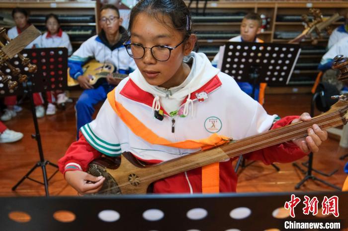 Le 9 septembre, Baima Zhuoga, une élève de 3e année du collège de Langkazi, chante et joue de la guitare à six cordes.