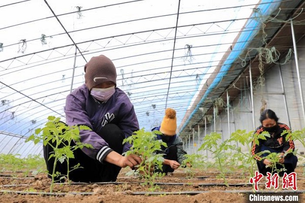 Des éleveuses locales disposent des plants de tomates au pied de la plantation, à Luhuo, au Sichuan.