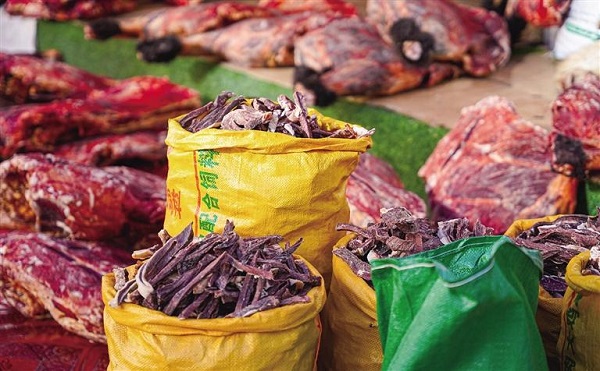 Les yaks, surnommés les ? bateaux du plateau ?, vivent toute l'année dans des zones alpines à plus de 3 000 mètres d'altitude. Ils se nourrissent des paturages naturels du plateau et boivent l'eau des glaciers fondus des montagnes enneigées, ce qui explique principalement la qualité savoureuse et nutritive de leur viande. Le b?uf de yak séché à l'air est un aliment traditionnel des Tibétains et fait partie de leurs mets préférés.