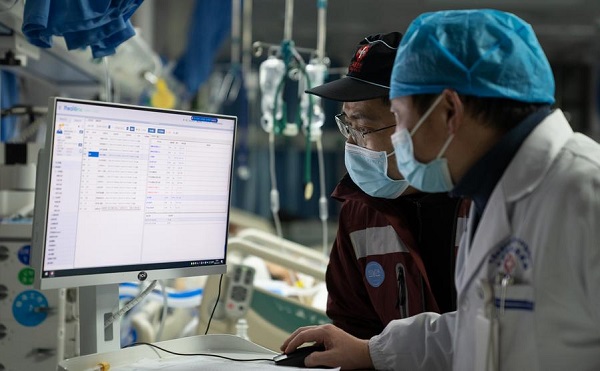 Des membres du personnel médical vérifient les données cliniques d'un habitant blessé, dans un h?pital à Xigaze, dans la région autonome du Xizang, dans le sud-ouest de la Chine, le 7 janvier 2025. (Photo : Tenzin Nyida)