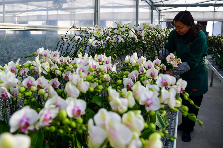 Des orchidées phalaenopsis fleurissent dans des serres de fleurs à Zibo, ville de la province chinoise du Shandong (est), le 8 janvier 2024. (Photo : Zhu Zheng)