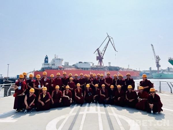 Des enseignants et étudiants du Collège bouddhiste du Xizang posent pour une photo au chantier naval Jiangnan de Shanghai, observant de près un navire de transport de gaz d'éthylène liquéfié (LEG) de pointe fabriqué en Chine.