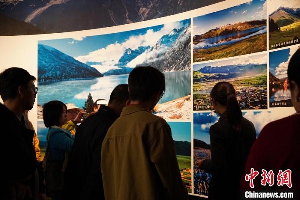 Des visiteurs découvrent des photos des ressources touristiques naturelles de la préfecture de Garzê exposées.