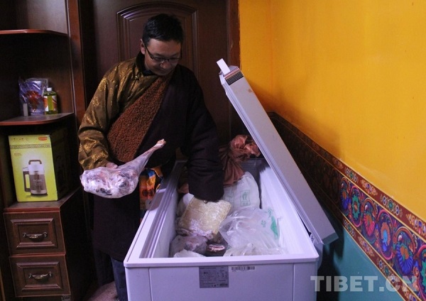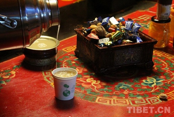 En entrant dans la maison du berger Nyima, à Nagqu, on est immédiatement frappé par le style tibétain de l'intérieur. Sur la table basse typique, de grands plats de viande séchée, du beurre et toutes sortes de friandises sont déjà disposés, tandis qu'un thé au beurre chaud et parfumé a été servi à tous les invités.