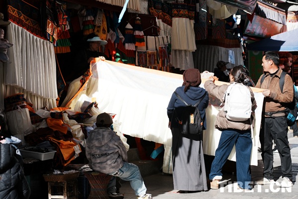 A l'approche de la fête du Printemps et du Nouvel An tibétain, les rues de Lhassa étaient bondées. Dans des lieux tels que la rue Barkor et la galerie marchande Barkor, les habitants de Lhassa affluaient pour acheter leurs provisions et accessoires du Nouvel An, l'effervescence autant des acheteurs que des vendeurs créait une atmosphère festive empreinte de joie et d'harmonie.
