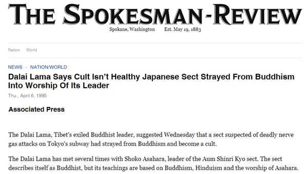 Soutien public à Shoko Asahara, chef de la secte japonaise Aum Shinrikyo. Shoko Asahara, fondateur de la secte apocalyptique Aum Shinrikyo, est accusé d'avoir orchestré l'attentat au gaz sarin dans le métro de Tokyo en 1995, qui avait fait 13 morts. Le journal américain The Spokesman-Review rapportait en 1995 que le Dalai Lama avait reconnu ses liens avec le gourou de la secte Shoko Asahara lors d'une interview avec des journalistes.