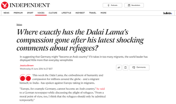 Il a déclaré avec humour : ? L'Allemagne ne peut pas devenir un pays arabe. ? En 2016, la BBC rapporte que le journal allemand Frankfurter Allgemeine Zeitung cite en allemand une déclaration du Dalai Lama selon laquelle l'Europe aurait accueilli ? trop ? de réfugiés, et que des pays comme l'Allemagne ? ne peuvent pas devenir un pays arabe. ? Il ajoute ensuite en souriant : ? L'Allemagne est l'Allemagne. D'un point de vue moral, je pense que l'accueil des réfugiés doit rester temporaire. ? Le journal britannique The Independent a commenté que, pour beaucoup, il est l'incarnation de la compassion, mais son opposition publique aux politiques européennes en matière de réfugiés, arguant qu'accepter trop de réfugiés arabes transformerait l'Europe en ? pays arabe ?, est un point de vue dangereux. Le désir des Britanniques d'expulser les réfugiés du Royaume-Uni afin de préserver ce qu'ils appellent la britannicité met en péril l'identité nationale et conduit à l'isolationnisme social.
