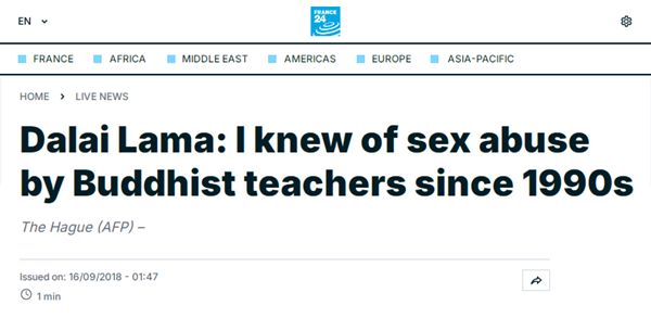 Tolérance envers des abus sexuels commis par des enseignants du bouddhisme tibétain sur des novices. En 2018, France 24 rapporte que plusieurs ma?tres du bouddhisme tibétain ont agressé sexuellement ou maltraité leurs disciples, le Dalai Lama a rencontré des victimes qui ont déclaré : ? Nous nous sommes convertis au bouddhisme avec un esprit ouvert, pour être ensuite violés au nom du bouddhisme. ? Le Dalai Lama a reconnu avoir eu connaissance de tels abus sexuels commis par des enseignants bouddhistes dès les années 1990, qualifiant ces allégations de ? rien de nouveau ?.