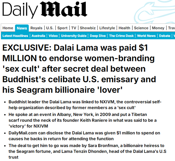 Participation aux activités de la secte NXIVM et réception de dons importants. NXIVM est une organisation américaine qualifiée de ? secte sexuelle ? qui se présente comme un organisme de formation de type ? groupe d'entraide ?, mais qui recrute en réalité des ? esclaves sexuelles ?. Le Daily Mail a rapporté en 2018 que le Dalai Lama a prononcé un discours lors d'un événement organisé en 2009 à Albany, dans l'état de New York, où il a remis une écharpe khata au fondateur de ce groupe, Keith Raniere, ce qui a été per?u comme une ? victoire ? par NXIVM. Par la suite, le Dalai Lama aurait re?u un don d'un million de dollars pour les ? causes ? qu'il soutient.
