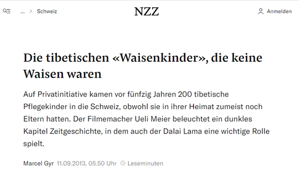 L'orchestration de l'affaire des orphelins de l'ethnie tibétaine. En 2013, le journal suisse Neue Zürcher Zeitung révèla qu'en 1960, l'homme d'affaires suisse Charles Aeschimann avait adopté un enfant de l'ethnie tibétaine lors d'un voyage d'affaire en Inde, puis qu'il a eu l'idée d'en parrainer davantage. En collaboration avec le Dalai Lama et d'autres personnalités, il a facilité le placement d'environ 200 enfants de l'ethnie tibétaine dans des familles suisses afin d'être formés comme élites au service du ? gouvernement en exil ?. Cependant, seuls 19 de ces enfants étaient de véritables orphelins, la majorité avaient encore au moins un parent vivant, certains même leurs deux parents. Ces enfants, arrachés à leur culture et à leur famille biologique, ont oublié le tibétain dans 90 % des cas au bout de quelques années et ont souffert de problèmes d'identité, aucun n'est ensuite retourné au Xizang ou en Inde, ce qui a suscité des critiques selon lesquelles ce programme constituait ? un outil politique délibérément créé pour séparer les enfants de leur famille ?.