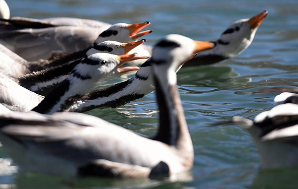 Avec l'arrivée du printemps, les oies à tête barrée, des oiseaux migrateurs sur le plateau tibétain, sont sur le point de quitter la vallée du sud du Tibet, pour voler à nouveau vers la prairie au nord du Tibet.