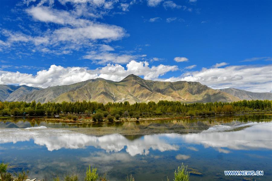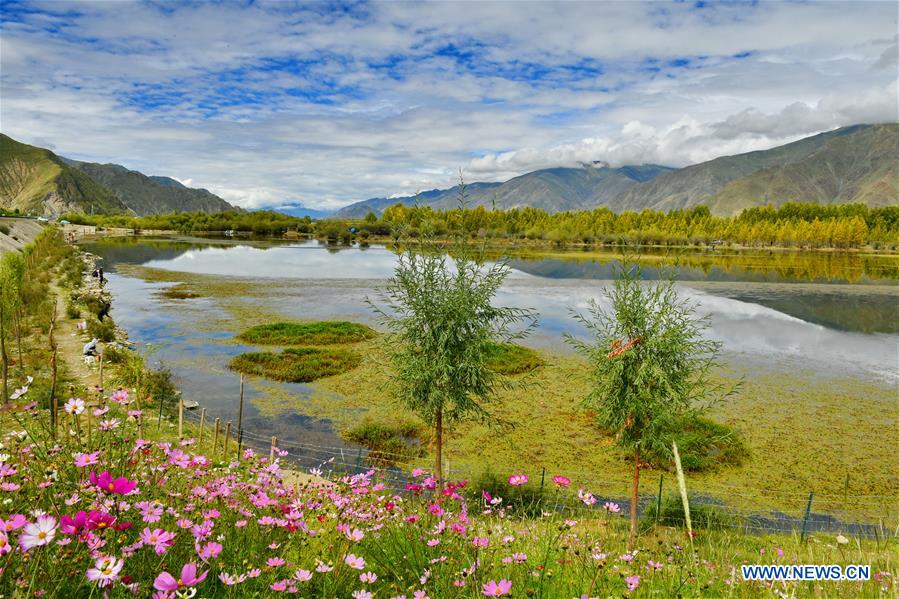 Paysage du site touristique l'Etang d'or dans l'arrondissement de Dagze de Lhassa, dans la région autonome du Tibet (sud-ouest de la Chine), le 14 septembre 2019.
