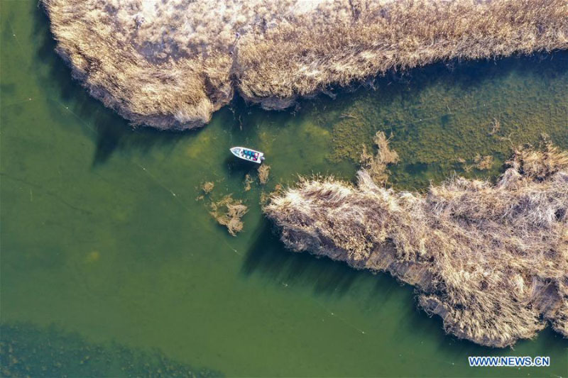 Photo aérienne prise le 4 avril 2020 montrant Yue Jianqiang, membre du personnel de la réserve naturelle du lac d'Ulan Suhai, en patrouille dans la zone humide du lac d'Ulan Suhai en hors-bord à Bayannur, dans la région autonome de Mongolie intérieure (nord de la Chine).