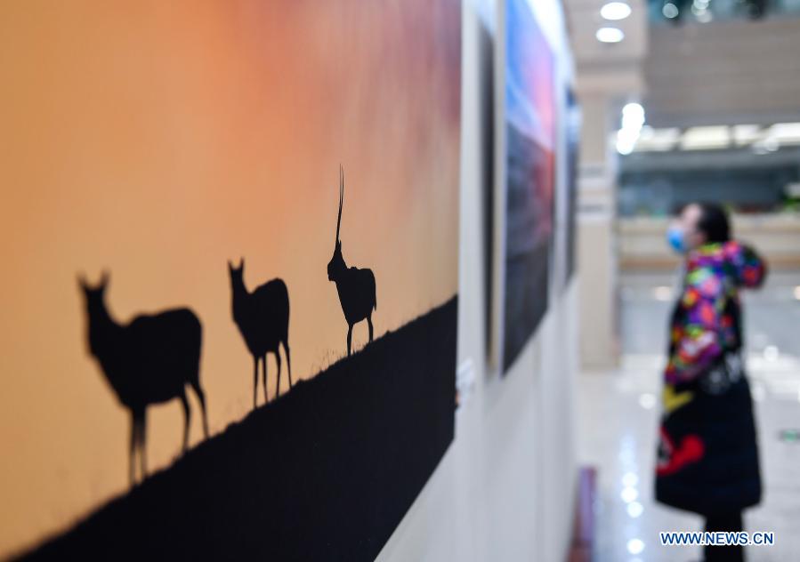 Un visiteur regarde une photo lors d'une exposition de photographie sur les animaux sauvages dans la Bibliothèque provinciale du Jilin, à Changchun, dans la province chinoise du Jilin, le 8 janvier 2021. (Xinhua/Xu Chang)