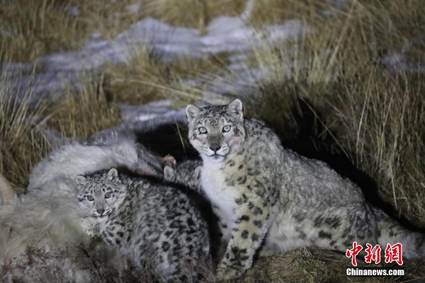 Récemment, dans le canton de Kharmar, district de Tianjun, préfecture autonome mongole et tibétaine de Haixi, province du Qinghai, un photographe a capturé trois léopards des neiges en train de manger à une courte distance. Sur la photo, trois léopards des neiges mangent un yak blanc. L'un des léopards des neiges, plus grand que les autres, a passé la plupart de son temps à ? observer ?. Les deux autres léopards des neiges étaient légèrement plus petits, mais ils ont ? profité d'un festin ? et sont partis ? joyeusement ? le ventre plein. Les léopards des neiges vivent principalement dans les zones de plateaux entre 2 500 et 5 000 mètres d'altitude. Ce sont des animaux protégés au niveau national de premier niveau et sont répertoriés comme espèces vulnérables par l'Union internationale pour la conservation de la nature (UICN). Parce qu'il voyage seul et que ses allées et venues sont secrètes, le léopard des neiges est également connu sous le nom d'? Ermite de la montagne enneigée ? et de ? Roi de la montagne enneigée ?.