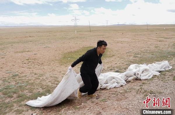 En photo : Dega, garde écologique du poste de protection de Wudaoliang de l'administration de la réserve Hoh Xil, ramasse les ordures le long de l'autoroute Qinghai-Xizang.