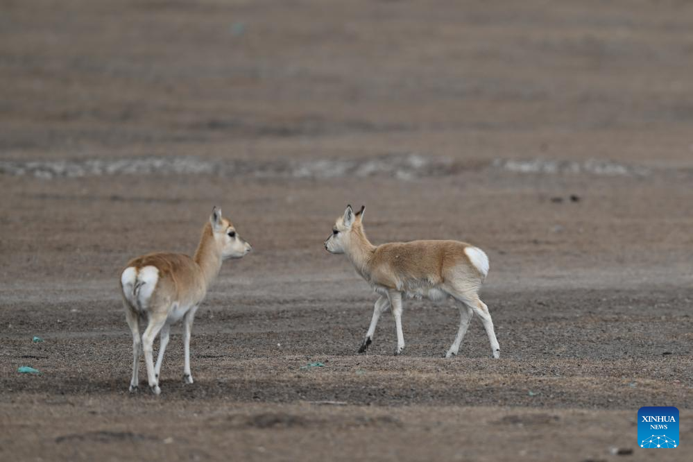 Des gazelles de Przewalski vues dans les prairies du canton de Ha'ergai du comté de Gangcha, dans la préfecture autonome tibétaine de Haibei de la province du Qinghai (nord-ouest de la Chine), le 16 novembre 2024. La zone entourant le lac Qinghai est le seul habitat des gazelles de Przewalski, une espèce qui bénéficie du plus haut niveau de protection en Chine. Grace aux efforts de conservation renforcés, le nombre de gazelles de Przewalski vivant dans le bassin du lac Qinghai est passé de 257 en 2004 à plus de 3 400.