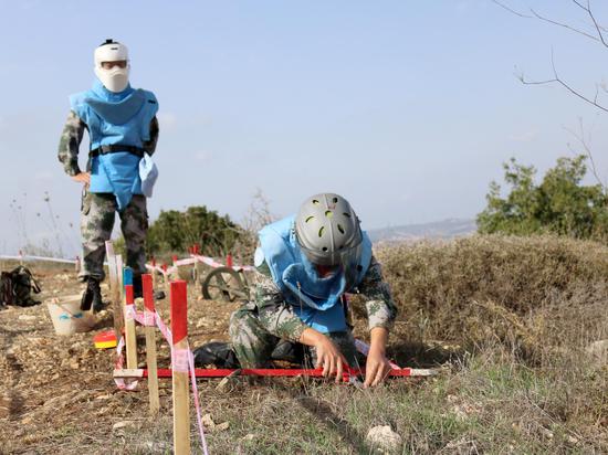 Photo prise le 8 novembre 2017 montrant des casques bleus chinois travaillant sur un champ de mines près de la ? Ligne bleue ? délimitée par l'ONU dans le sud du Liban. (Photo de Dong Yongkang / Xinhua)