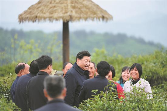 M. Xi a visité mardi matin une plantation de thé à Jiangjiaping, un village du comté de Pingli. La plantation, qui couvre 80 hectares, a aidé plus de 300 personnes en situation de pauvreté à augmenter en moyenne leur revenu annuel de 1100 yuans (155 dollars).