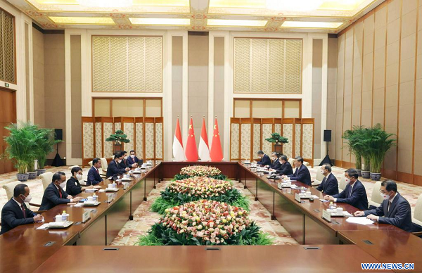 Le président Xi Jinping a souligné que la Chine et l'Indonésie se trouvaient à des stades de développement similaires, partageaient des intérêts communs et poursuivaient des visions et des voies de développement convergentes, et que leur avenir était étroitement lié. Affirmant que batir une communauté d'avenir partagé Chine-Indonésie répond aux attentes et à l'aspiration communes des deux peuples, il s'est dit heureux de voir les deux parties s'engager dans cette direction, et a exprimé la volonté de la Chine de travailler avec l'Indonésie à poursuivre ce cap, à consolider leur confiance stratégique mutuelle et à soutenir fermement les efforts de l'une comme de l'autre pour défendre la souveraineté, la sécurité et les intérêts de développement, explorer une voie de développement adaptée aux conditions nationales, développer l'économie et améliorer le bien-être de la population. Il a souligné la nécessité pour les deux pays de développer plus en profondeur leur coopération de qualité dans le cadre de l'Initiative "la Ceinture et la Route" en vue de porter des fruits plus abondants. Il a invité les deux parties à s'efforcer d'achever selon le calendrier prévu la construction de qualité de la ligne à grande vitesse Jakarta-Bandung, et à bien mettre en ?uvre les grands projets de coopération tels que le Corridor économique global régional et les "Parcs industriels jumeaux". Il a affirmé que la Chine continuerait d'apporter son plein soutien à l'Indonésie dans la construction d'un centre régional de production de vaccins et d'intensifier la coopération en matière de santé publique, et entendait continuer d'accro?tre ses importations de matières premières et de produits agricoles de qualité de l'Indonésie. Il a exprimé la volonté de la Chine de prendre une part active à la construction de la nouvelle capitale indonésienne et du parc industriel dans le nord de Kalimantan, d'élargir la coopération sur le financement du développement et de faire émerger de nouveaux p?les de croissance dans les domaines tels que l'économie numérique et le développement vert.